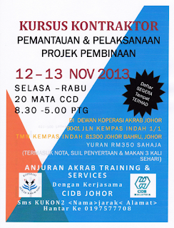 Kursus terbaru iaitu Kursus Kontraktor Teknik Penyediaan Sebut Harga Kompetatif akan diadakan pada 3-4 Disember 2013 bermula 8.30 - 5.00 petang di Dewan Koperasi Akrab Johor Berhad, Taman Kempas Indah, Johor Bahru yang menawarkan 20 mata CCD.